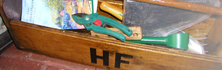 The Arbor, which extends from the North side of the house, is a formal English style, modeled on a Edwin Lutyens garden. It is a formal design, with large scale climbers and other plantings inside the arbor, but in a somewhat casual or loose array. This trellis garden was put in only 2 years ago. There is also the use of planters inside the pool area, which is a French influenced treatment. At the rear edge of the house, near the back porch, is a small area with potted plants of various types including a Brown turkey fig tree and roses. The fern hanging on the back porch is a nod to the Victorian past.
